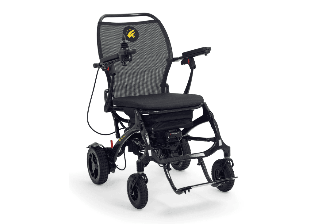 The all-new Cricket Power Wheelchair is stylish, agile, and extremely portable. Crafted with an incredibly strong yet lightweight 100% carbon fiber frame, the Cricket weighs as light as 33 lbs.*, making travel a breeze! The slim sporty design is perfect for navigating indoors and out while sightseeing, shopping, or dining. The roomy padded seat cushion and durable mesh back align with the natural curves of your body providing long-lasting comfort while on the go.